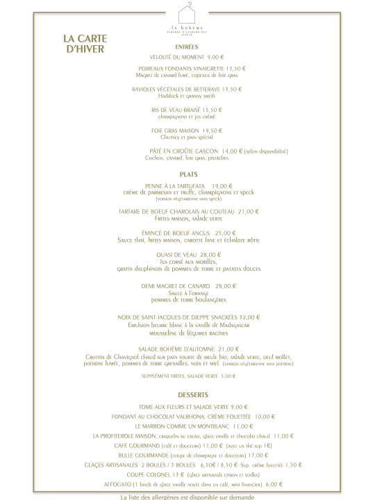 La carte change à chaque saison et donne lieu à de nouvelles inspirations culinaires.